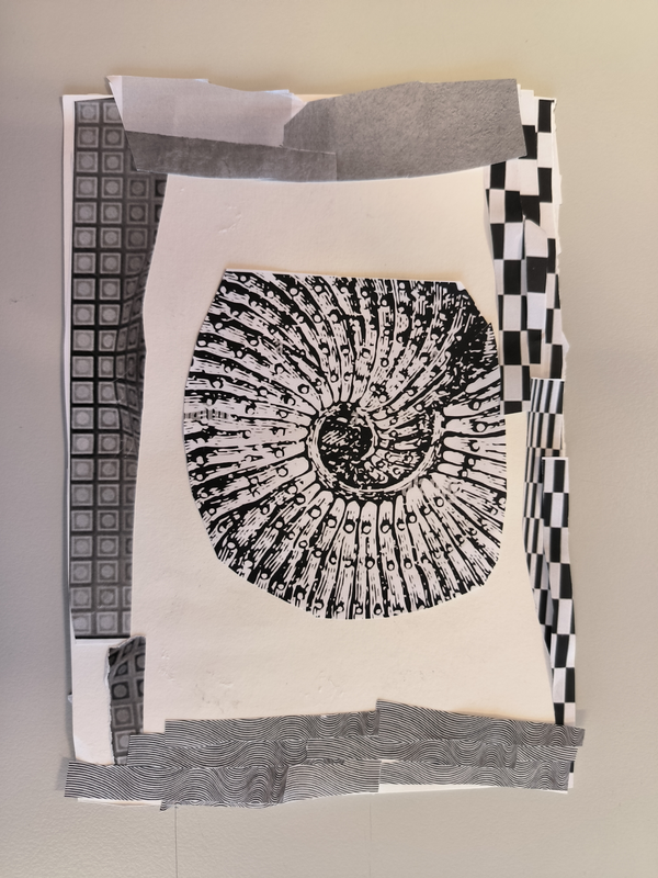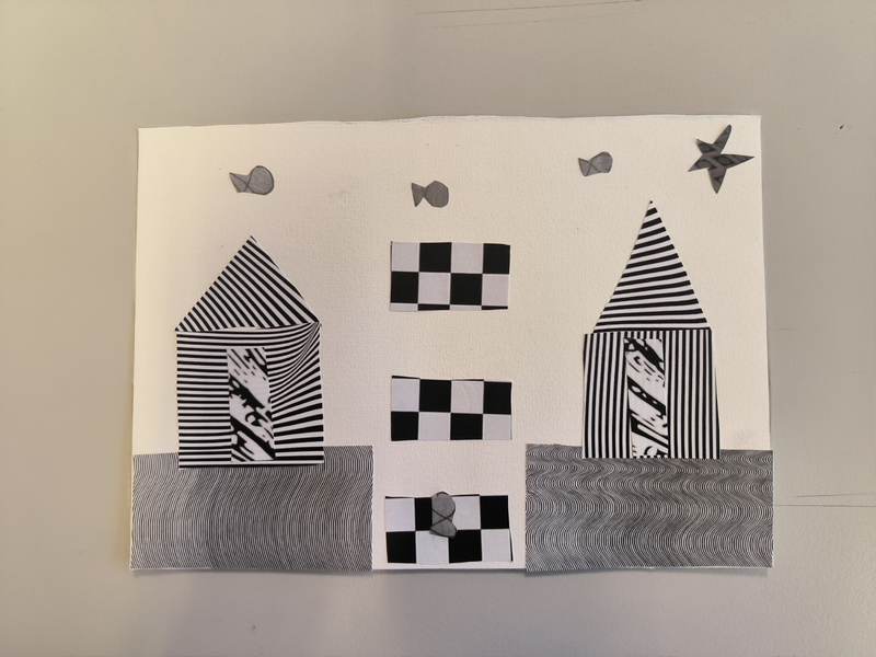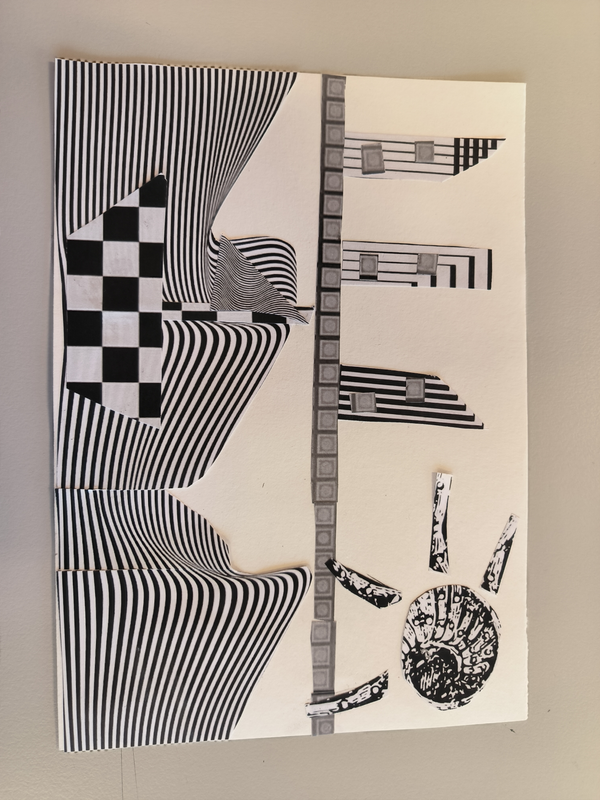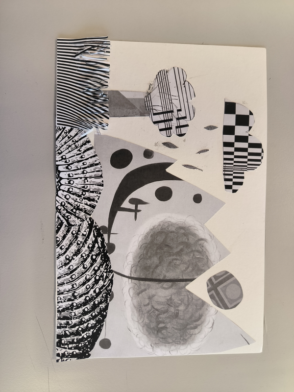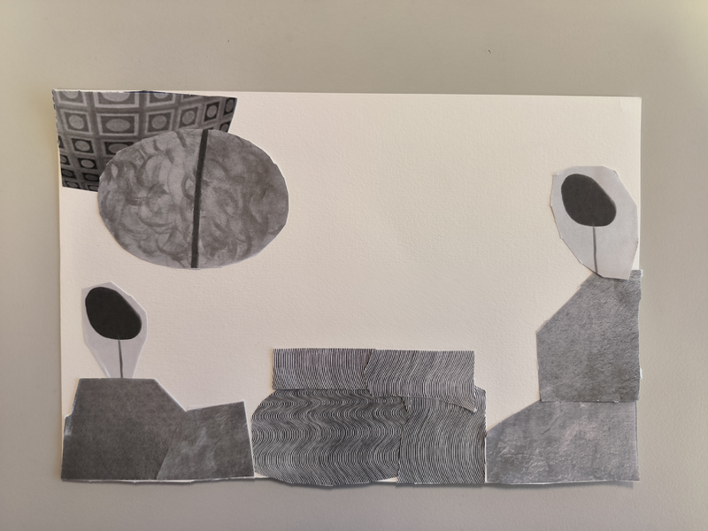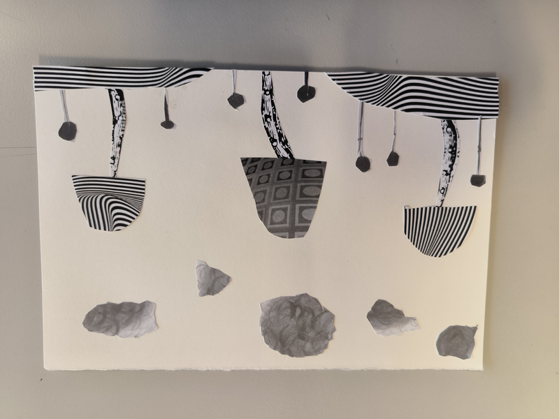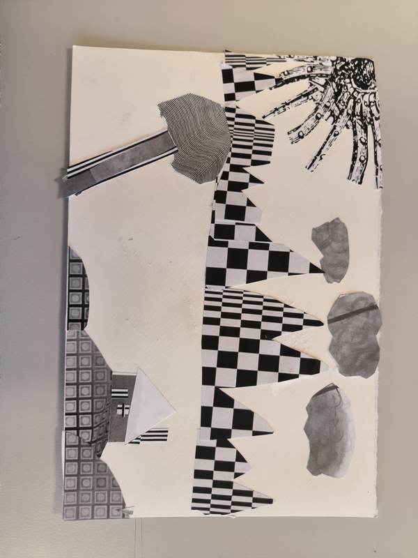Mon dessin représente une colline dispersé. J'ai juxtaposé différents collages aux formes symétrique différentes pour former les collines ainsi qu'en mélangeant les différentes nuances de gris. Le soleil est un collage en forme de coquillage. Et de l'autre côté j'ai formé une lune afin de représenté le jour et la nuit.