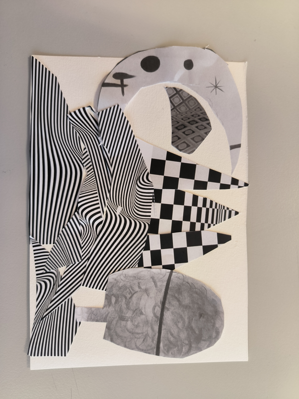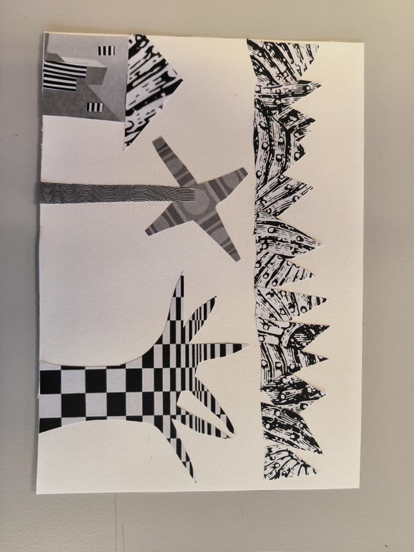 Pour réaliser les montagne qui sont situer en haut, j'ai découper des triangles de formes exagérer en les collant sur la feuilles afin d'entreposer les bout des triangles. J'ai utiliser cette photocopie pour crée comme une avalanches de neige sur les montagnes mais aussi différentes valeurs de gris pour crée des contraste .