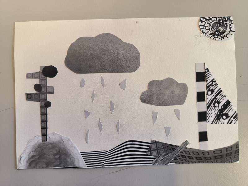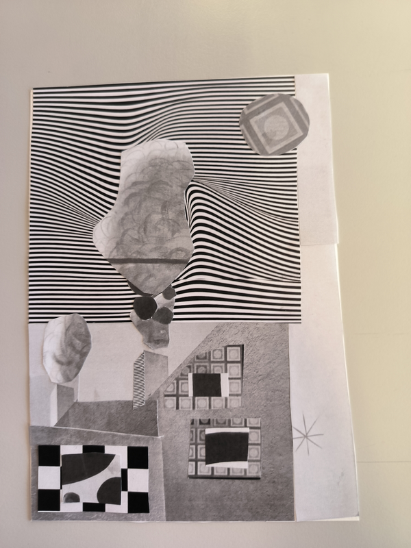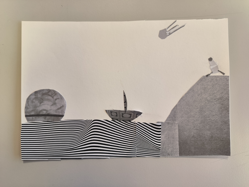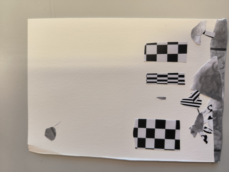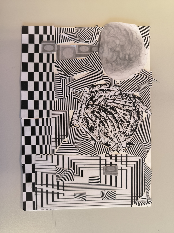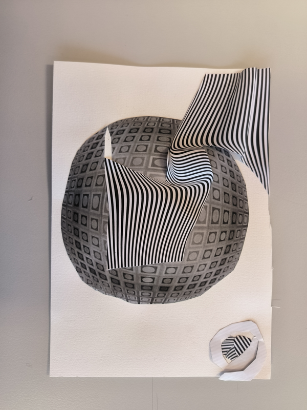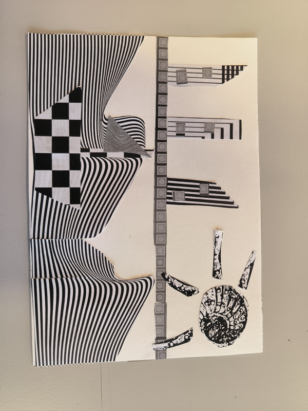 - La colline est composé de plusieurs morceaux de papiers du même motif que j'ai assemblé entre eux pour créer un aspect de relief et de mouvement grâce au contraste de blanc et de noir.