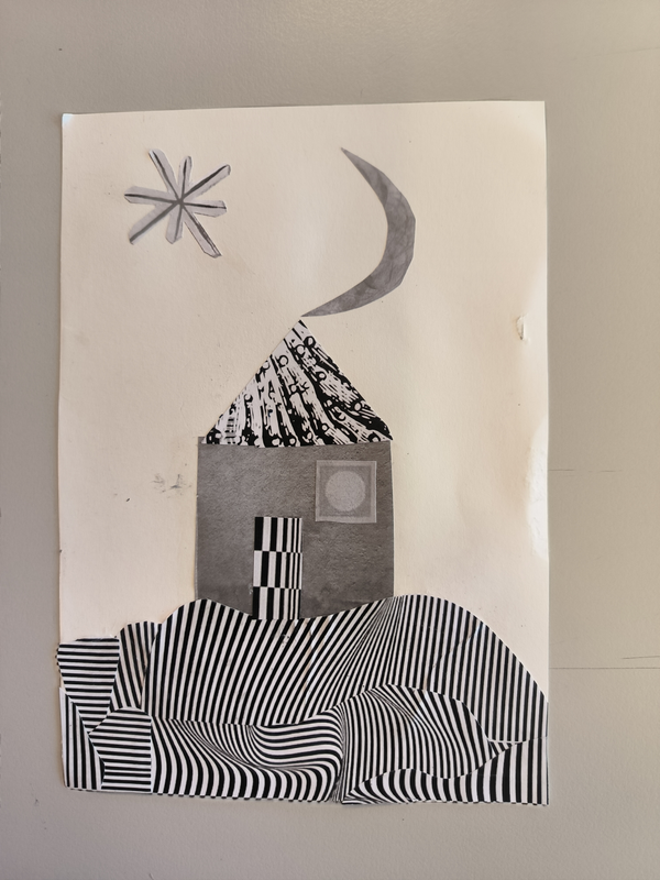 Mon dessin représente une maison, au clair de lune, perchée sur une colline. Pour réaliser ce dessin j'ai utilisé la méthode de collage.