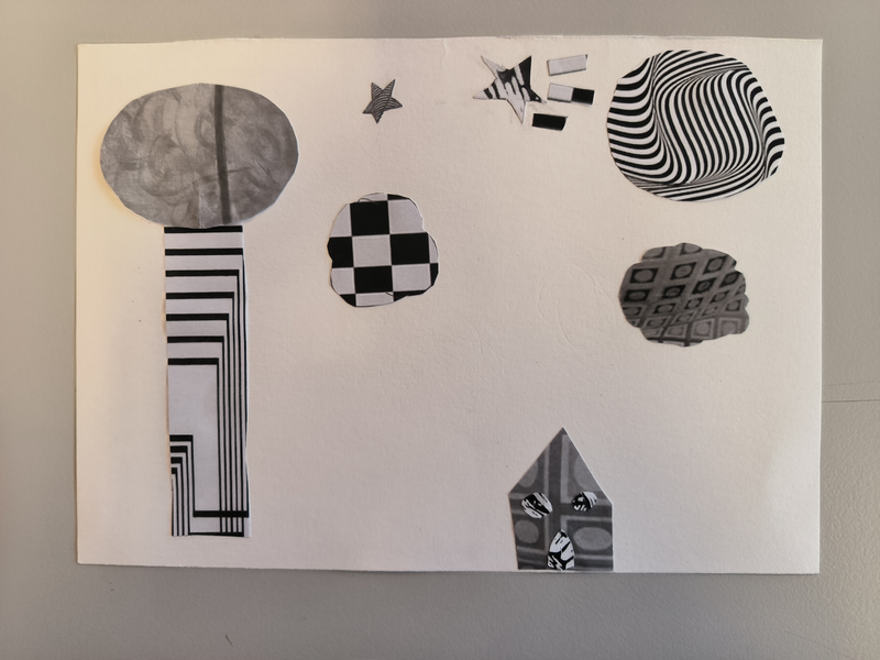 Arbre: Dans un papier j'ai découper et coller un rectangle, j'ai choisi ce motifs car pour moi ça représenter des contrastes. Puis dans un autre papier j'ai découper un cercle.