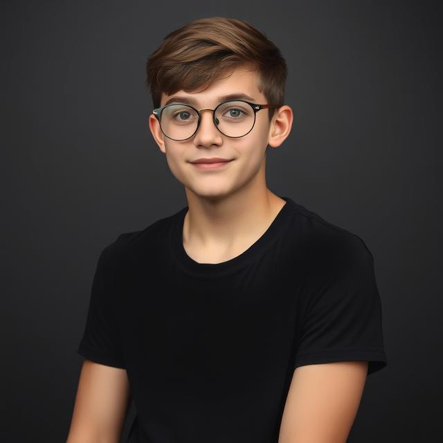 je veux une photo d un garcon adolesent avec des lunette noir et dorée et les cheuveux en coupe casquette brun avec un tee shirt noir de 15 ans