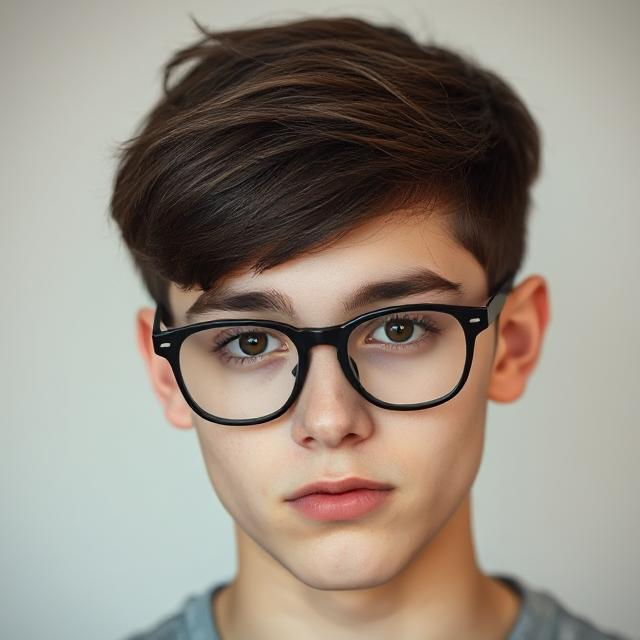 je veux une photo réaliste de face d'un adolescent de 14 ans avec les cheuveux marron foncé coiffer avec mes cheuveux a l'avant court qui cache tout mon front coupé court coiffer en remontant sur le coté il porte des lunette noir il a les yeux marron des levres fini une machoir prononcer un nez fin