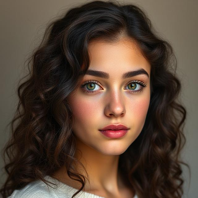Tu es un dessinateur, tu dois représenter le buste d'une adolescente. Elle a des long cheveux marrons et bouclés, des yeux verts, des sourcils normaux et un visage rond