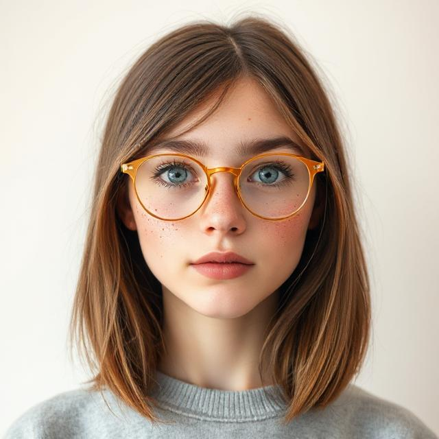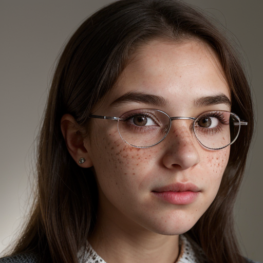 tu doit representer en photographie réaliste le portrait du buste d'une jeune fille de 20 ans qui a des taches de rousseur sur le nez le front et le dessu de levre. son nez est en trompette et ses yeux son brun. Elle a des cheveux brun long et onduler.Elle a des fines lunette argenter et sa peau est beige elle a un sweat shirt noir.