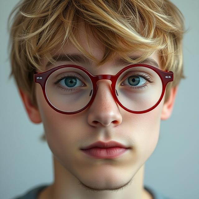 L'image présente une personne au regard captivant, dont les cheveux blonds et bouclés encadrent délicatement le visage. Elle porte des lunettes rondes à la monture rouge, qui ajoutent une touche de couleur et de caractère à son apparence. Ses yeux, grands ouverts, fixent directement l'objectif, créant une connexion immédiate avec l'observateur. L'arrière-plan, sobre et clair, permet de concentrer toute l'attention sur les traits du visage, soulignant une expression faciale neutre, teintée d'une légère gravité. L'ensemble dégage une impression de simplicité et de profondeur, invitant à une contemplation plus approfondie.