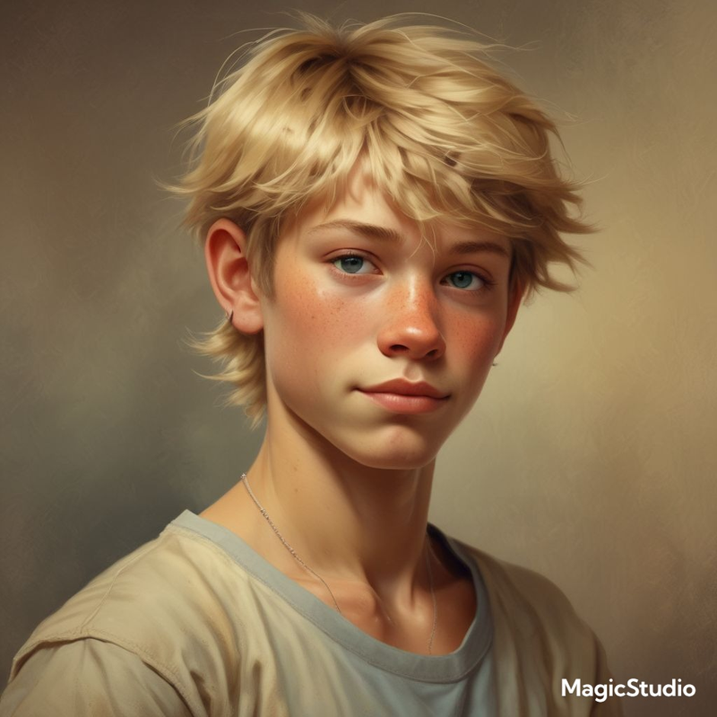 francais : crée moi un avatar qui est agé de 14 à 16 ans avec un prompt realist de la tete au pieds il doit etre blond avec une coupe vers l'avant avec des yeux marrons foncé, sur ses joue beaucoup de taches de rousseur une peaux assez bronzé mais pas trop la photo de etres tres réalist
