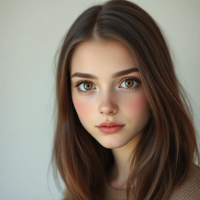 crée moi une image d'une fille de l'age de 15 ans qui a les cheveux mi long arrivant au niveau de la poitrine bruns foncé avec sur le visageen forme de diament des yeux bruns et vert avec le nez fin . elle a une bouche de taille moyenne , son tein est plutot blanc avec des joue un peu rouge